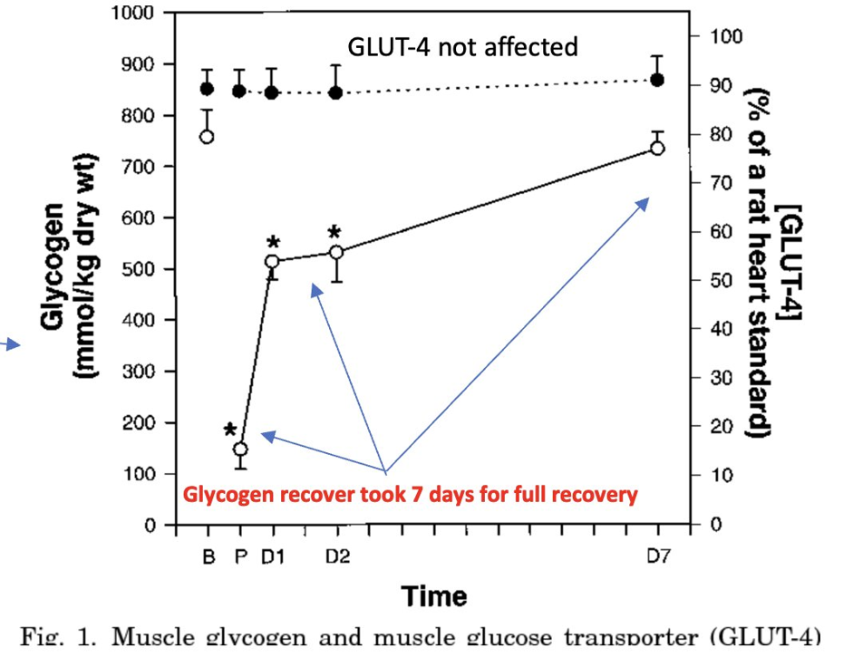 Si bien el contenido de GLUT-4 permanece sin cambios, el contenido de glucógeno tarda varios días en recuperarse después del daño muscular.