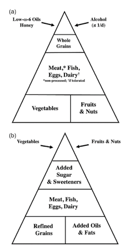 Comparación de la actualización del modelo cazador-recolector y las dietas modernas como pirámides alimenticias. (a) Contribución aproximada de los principales grupos de alimentos a nuestra dieta propuesta (que se aparta de alguna manera de la dieta mediana de los cazadores-recolectores/HG recientes) por contenido calórico estimado. Los productos lácteos se incluyen según se toleren, la ingesta moderada de alcohol puede ser una opción, y la proporción total de calorías de productos animales que se muestra aquí es de alrededor del 45 %, en lugar de la mitad o más.