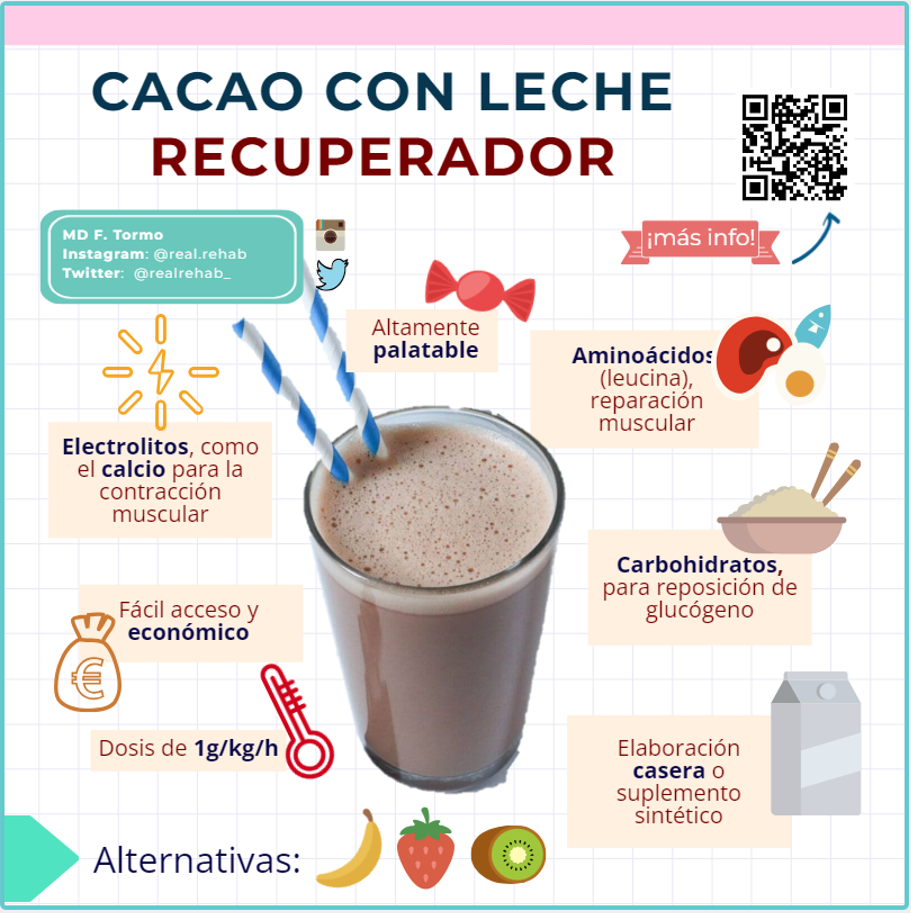 La leche con chocolate o cacao en polvo es una ayuda eficaz y de bajo coste para la recuperación con una relación carbohidratos:proteínas (CHO:PRO) similar a muchas bebidas comerciales.